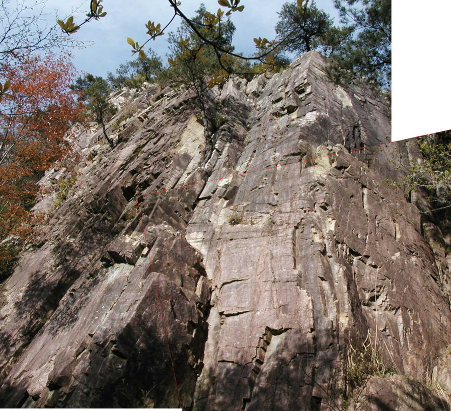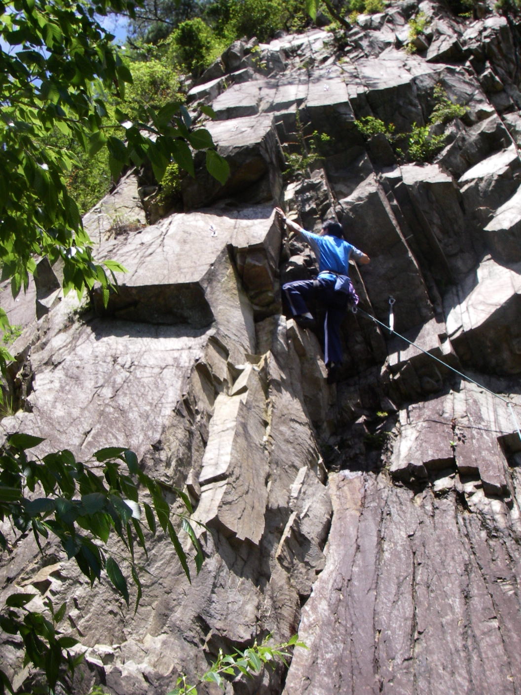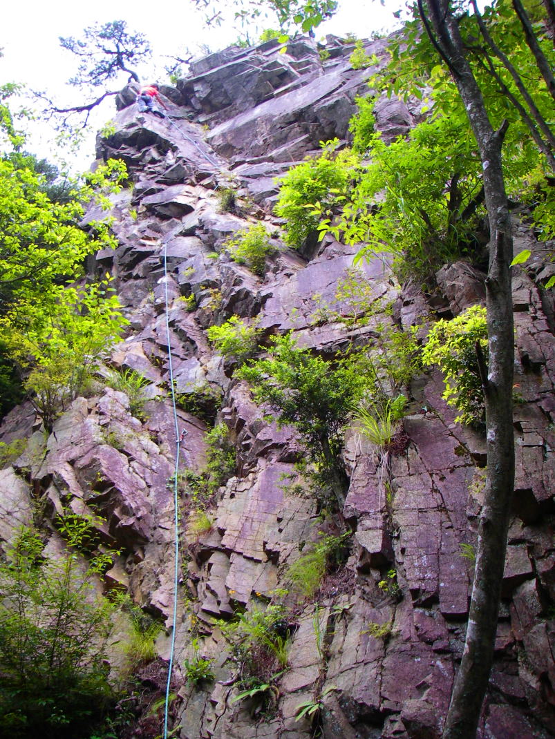 二度と来ないかも知れないと言うことで、もう一度最初の岩場に戻り、正面壁左の「リード初登ルート」を登ることにしました。ここも岩がもろく、ビレーは岩から離れて落石に注意しながら行いました。もちろんクライマーは真剣です。全員オンサイト。5.8ぐらいか? 上部を除いて支点間隔が遠いのと、大きな岩が外れかけているのを考慮して5.9。