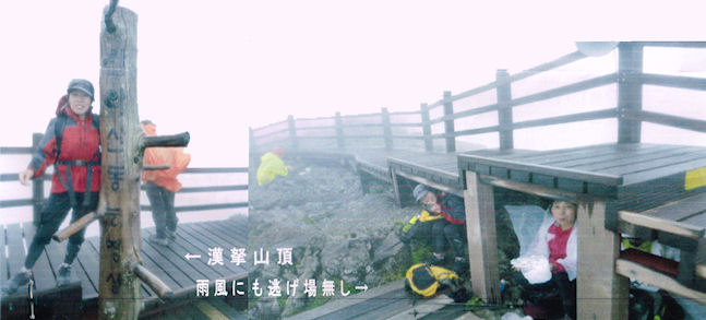 急登と有ったので覚悟して掛かるが「急坂」は現れず、代わりに急階段が続く、単調な階段登り、視界はピラミッド峰に着くまで全く無しでした。韓国の登山者は若者主体??軽装の若者が追い抜いて行く→10人余に追い越され 追い越したのは2人・・・。