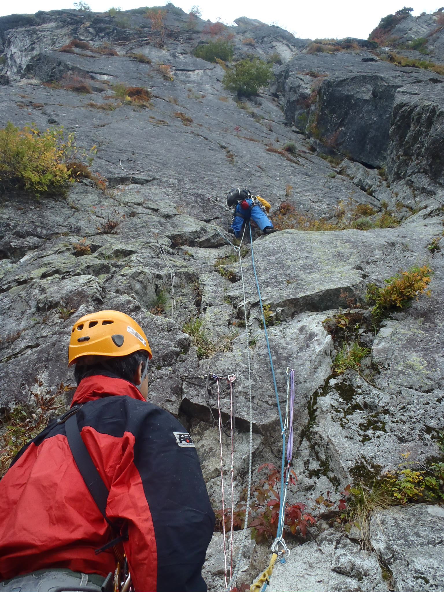 ときどき雨とも雪ともつかない物がサーッと降ってくる。扇岩の上のアブミのピッチで1回落ちてしまった。まさかアブミみたいに大きなホールドから足が外れるとは思わなかったので何も考えずにボーっと登っていたら突然足が外れてびっくりした。ここを通過すると本物の雨らしくなってきて、東壁ルンゼのスラブはヌルヌルになった。東稜を登っていた青木パーティはT2に下降してしまったので、屏風岩東壁は僕らの独占物になった。よくこんな所を後藤さんは登ったなというヌルヌルスラブを、すべてのピンをA0して登った。1ピッチはアブミも使った。終了は16時。後藤さんの頭にはまだ滝谷の2字が残っていたかもしれないが、僕と沖田さんの頭からはきれいに消えていた。時間は早いがここでビバークの準備をした。夜、少しだけ雪。