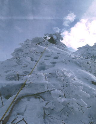 弥山尾根の取り付きまではトレースがあったので、そこからトラバースすれば時間が節約できたのに、かっこつけて滝沢尾根末端までトレースの無いところを直登していったものだから時間がかかって取り付くのが遅れてしまった。尾根に出てから調子よく登っていた日置さんが、ほんの2mほどの雪壁の前で、20分も30分も苦労している。下から見ると簡単に越せそうに見えるので、何してるんや、サッサと登ればいいのにと思ってビレーしていたが、次のピッチ、自分のリードの番になると、よくわかった。たいていのところは簡単に上って行けるのだが、怖くて一歩が踏み出せない雪壁が現れると1mか2mすすむのにすごく時間がかかってしまう。難所を抜けて上を見たら、もう難しいところはないように見えたが、下山が暗くなる可能性があるので降りることにした。いい経験をしました。